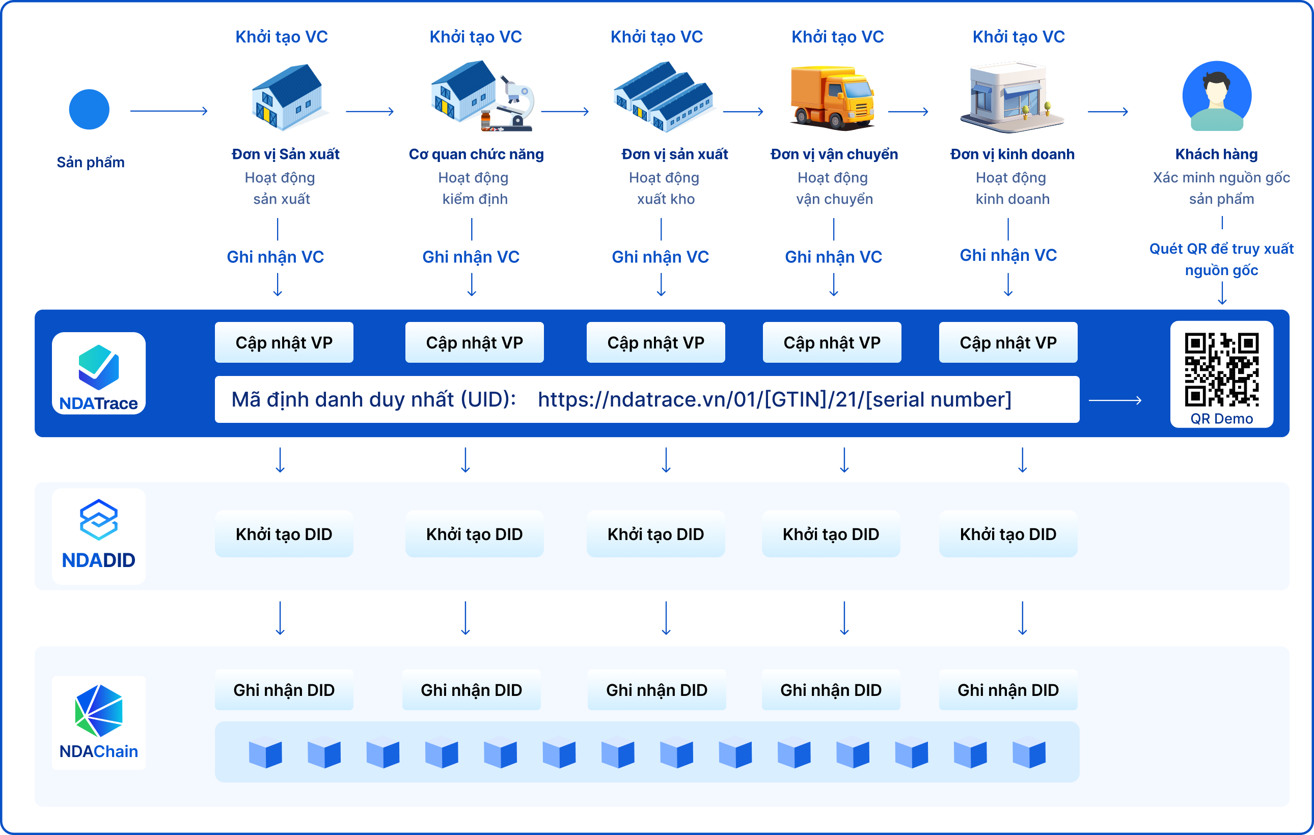 NDATrace PortalXác thựcCông cụ cho phép tổ chức, doanh nghiệp (Bên cấp phát) đăng ký tài khoản, khởi tạo DID sản phẩm và cấp phép phát hành bằng chứng xác thực VC cho các bên xác minh trong chuỗi cung ứng. Từ đó kiểm soát và giám sát toàn bộ vòng đời sản phẩm, quản trị quy trình sản xuất và vận hành tới tay người dùng.